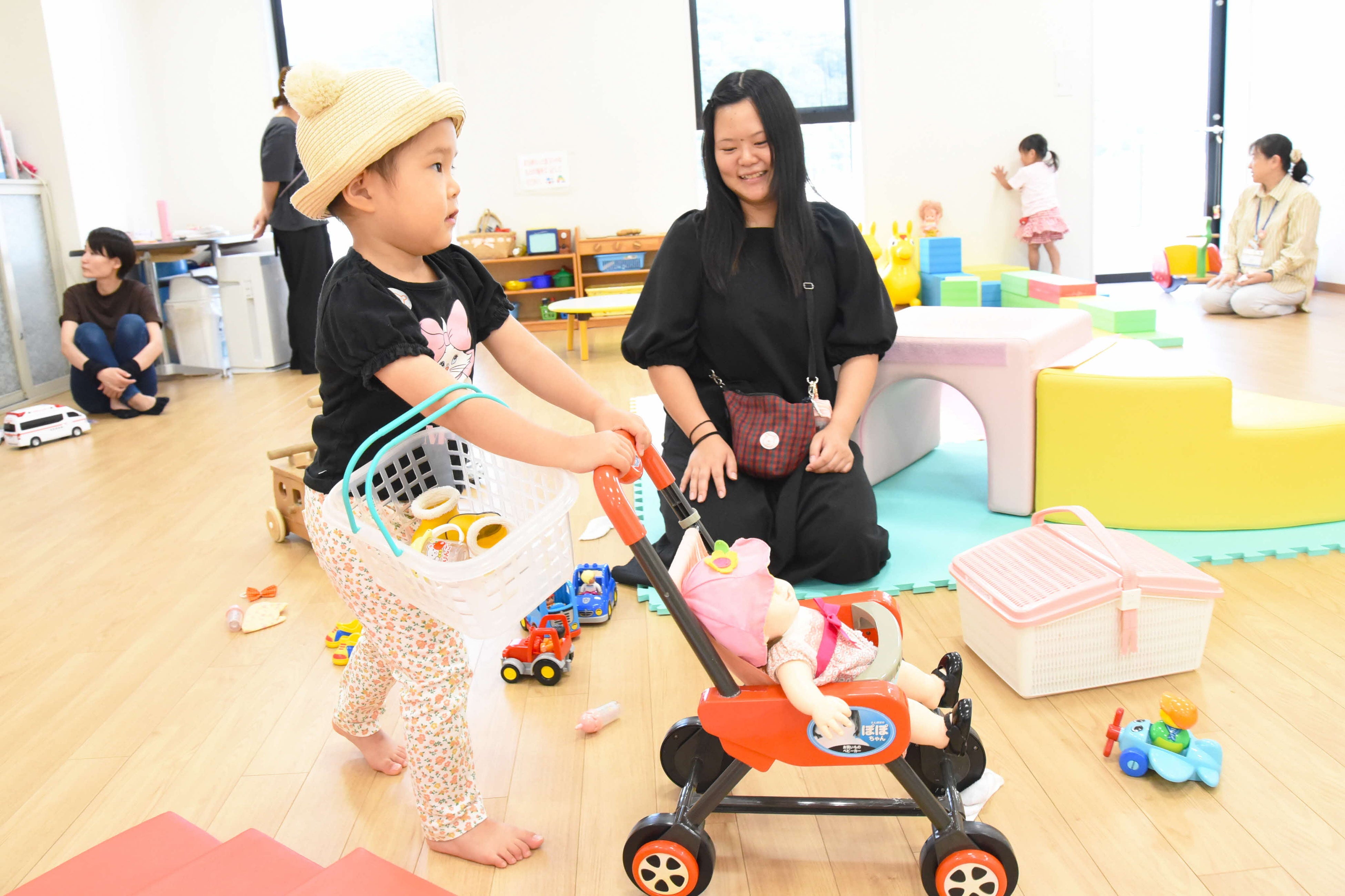 建物内に複数の部屋・設備があり、3階では、保健師や保育士などの相談員が主に未就学児の子育て相談を行ったり、親子の集いの場として、乳幼児を子育て中の方ならどなたでも気軽にご利用いただけるプレイルームの開放や、一時預かり保育を実施しています。