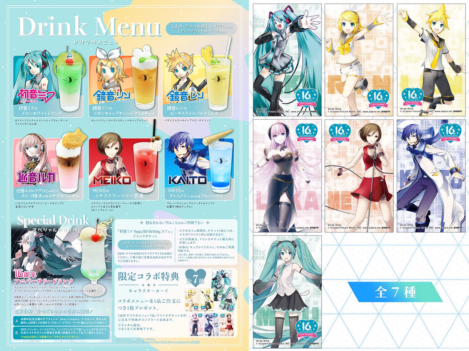・B:SNS(ツイッター、インスタグラム、フェイスブック)にハッシュタグ「#miku16th」、「#初音ミク」、「#キュアメイドカフェ」をつけて作品やコラボカフェの感想を投稿!投稿をスタッフまでご提示ください。