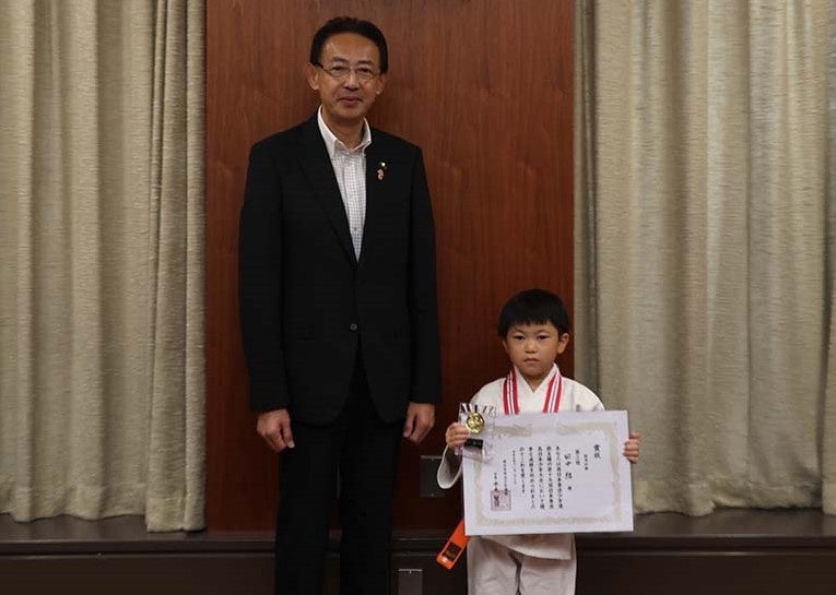 高槻市立芝生小1年の田中結さんが日本拳法の全国大会出場を市長に報告