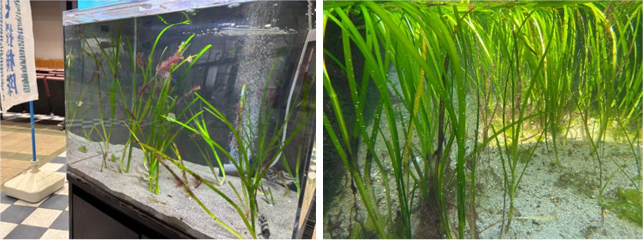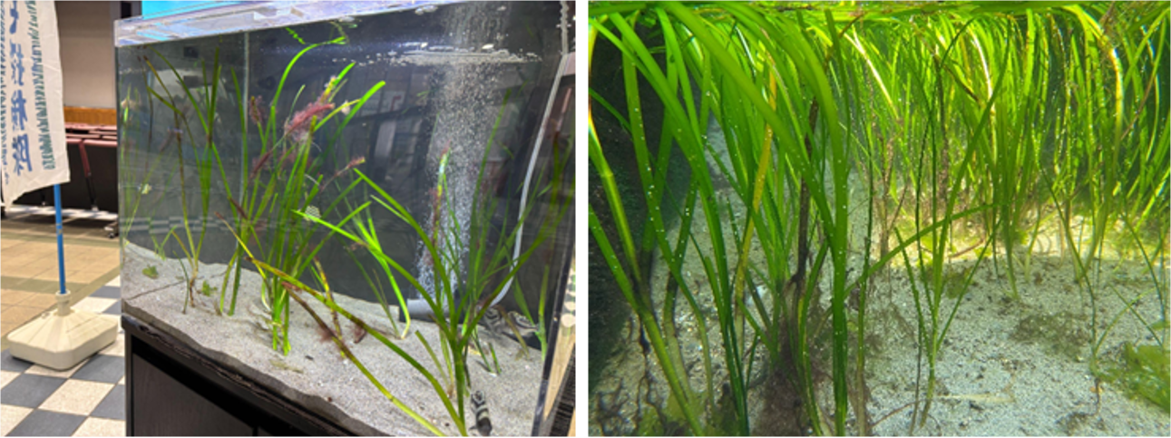 「アマモ」とは、日本各地、浜名湖の海中に生えている海草で、タネで株を増やす増え方が陸上のイネと似ています。根をかじると甘い味がするので「アマい+藻」=アマモの名前がつきました。魚や貝、エビやカニなどの生き物が卵を産み、子どもを育てるのにちょうど良い場所になるため「海のゆりかご」と呼ばれます。約11年ほど前から浜名湖のアマモが減り続け、豊かな浜名湖の生態系に影響を与えています。