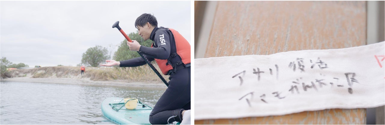 「海草アマモ」の種を、SUPで海上から種まき!浜名湖を取り囲む2市(浜松市・湖西市)で実施し、アマモ再生への思いをたすきに書いてリレーを行いました!