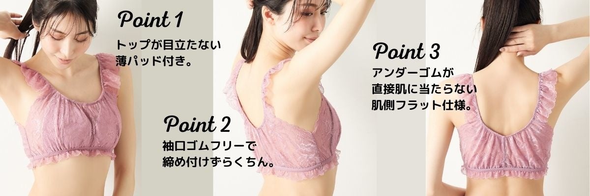 バストトップが目立たないように、薄パッド付き。袖口はゴムフリーにすることで締め付けを無くし、アンダーゴムも直接肌に当たらない肌側フラットな仕様にするなど、ラクな着け心地を徹底的に追求して開発することで、まさに『まるでNOブラ』を実現しました。ぜひ、『NOパン』&『NOブラ』で、下着の着用感から解放されたリラックス体験をお楽しみください。