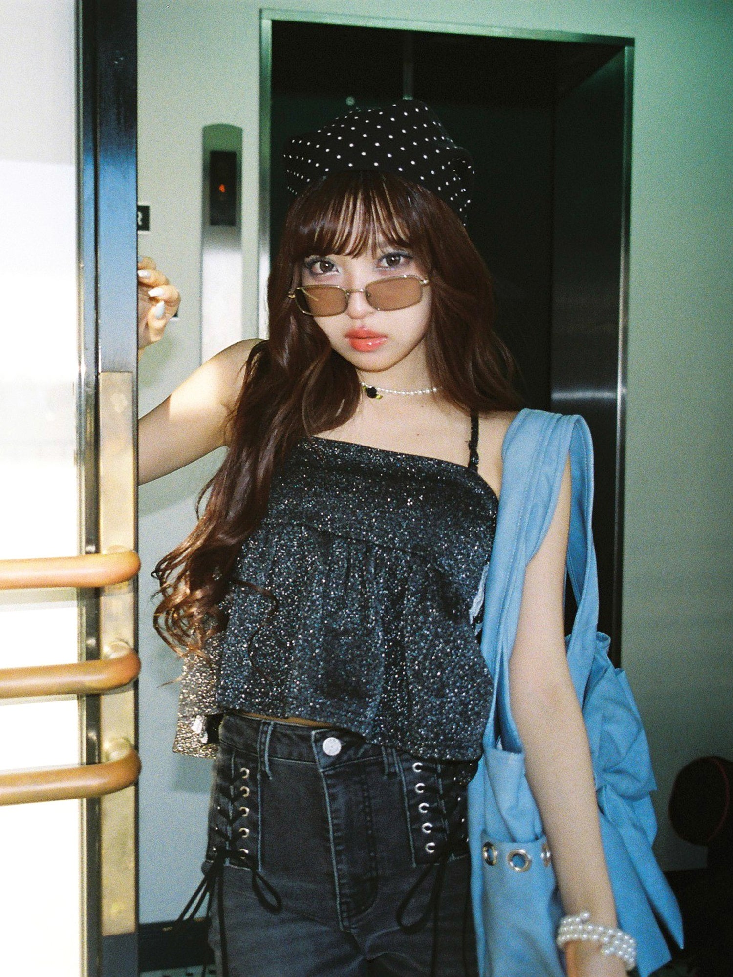 煌めくラメスウェット素材がこだわりのビスチェトップス。肩紐は気分に合わせてフロントでクロスに結んだり、取り外してベアトップとしても着用できるマルチウェイ仕様。
