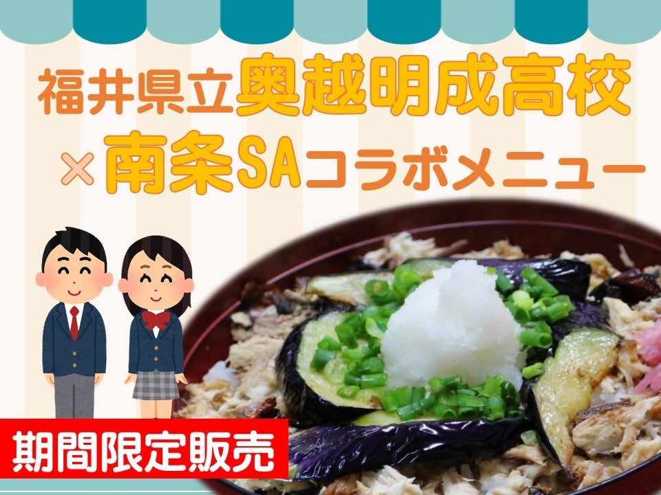 当メニューは、豊かな自然に育まれた福井県の食材や食文化を背景に、生徒が自らテーマを掲げ考案したレシピを、南条SA(上下)の料理人がアレンジして完成させたコラボメニューです。多種多様な地域のお客さまが立ち寄るSAの立地を活かし、当メニューの販売を通じて、福井の食の魅力を広く発信してまいります。