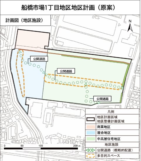 本地区計画では、船橋市地方卸売市場との連携も図りながら、南北に延びる海老川沿いの人の流れと船橋駅につながる東西の人の流れの結節点として、地域の利便性の向上及び憩いと賑わいの創出を図ります。また、良好な居住環境の形成及び環境や防災に配慮したまちづくりを目指すことが示されており、用途制限・壁面位置制限等の地区整備計画をはじめとした区域の整備・開発及び保全の方針について定められています。