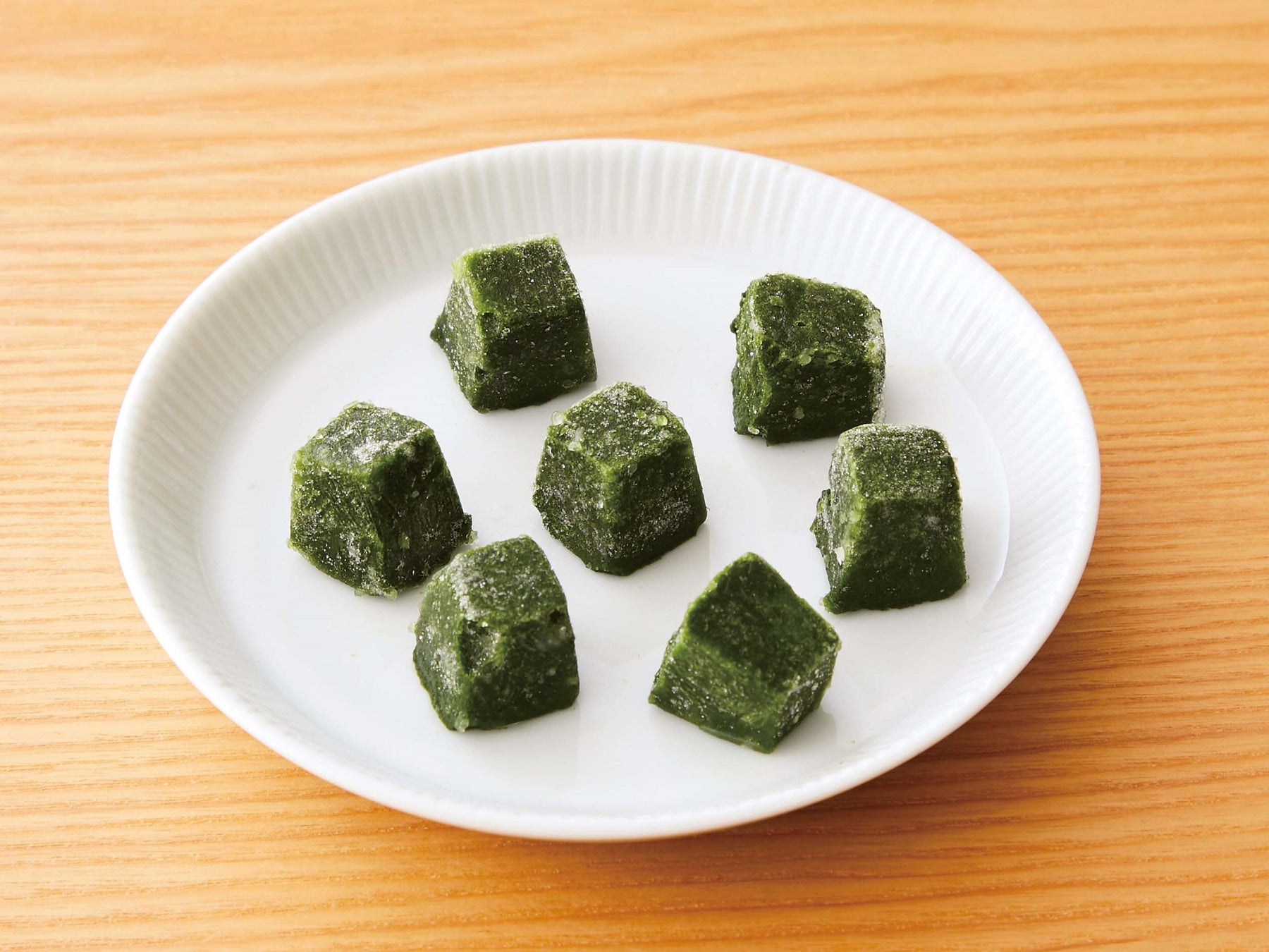 ほうれん草は、赤ちゃんに食べさせたい緑野菜の代表格といわれますが、繊維が多くうらごしに手間ががかり、多くの量を作ることは難しい野菜です。この悩みを解決するため、電子レンジで加熱するだけで使用できる冷凍キューブとしました。