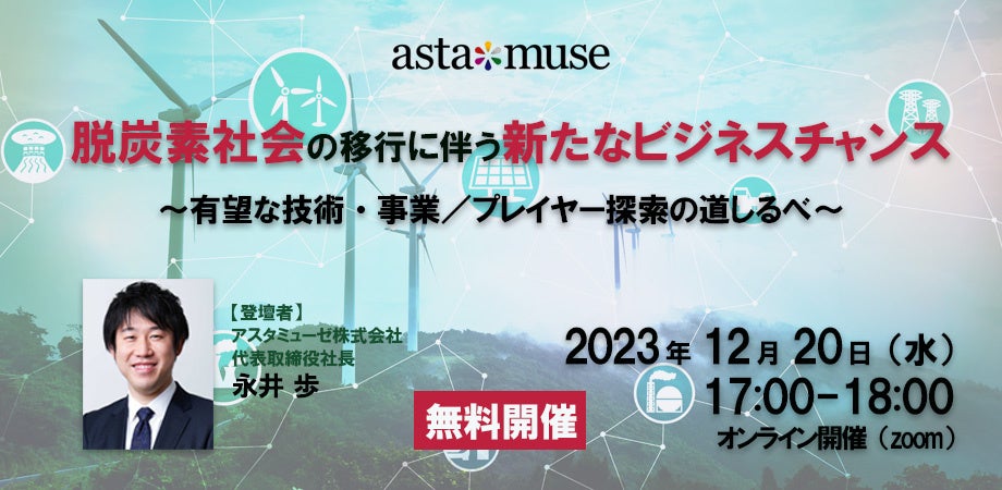 カーボンニュートラルがテーマの無料ウェビナー「脱炭素社会の移行に伴う新たなビジネスチャンス ~有望な技術・事業 / プレイヤー探索の道しるべ~」を12月に再開催