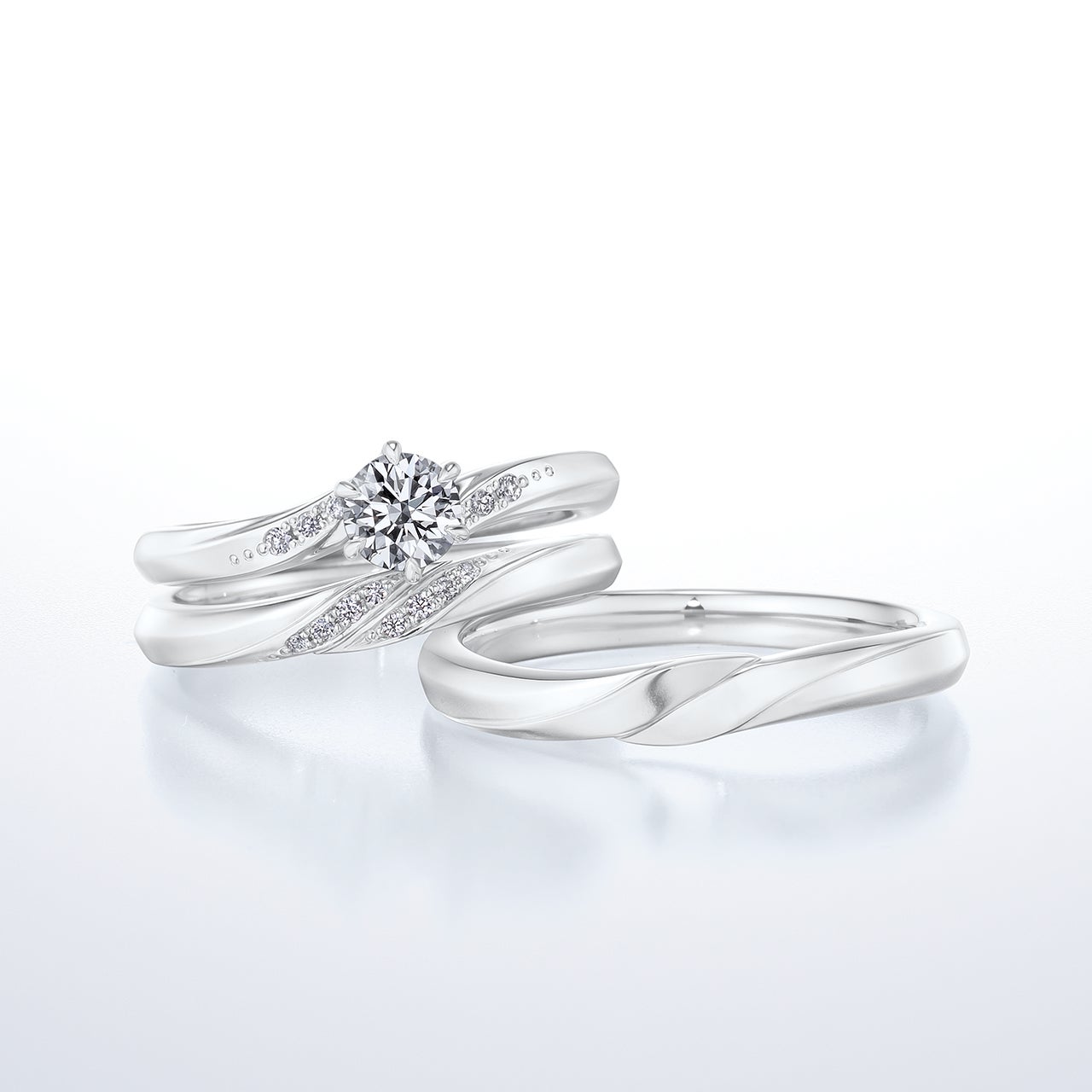 プラチナの立体感で結ばれたふたつのラインから、日常に溶け込みながらも確かにそこにある愛を感じられます。心地の良いウェーブ感と、メレダイヤモンド(*)の輝きですべてを愛で包み込むような柔らかさ(右)、角度の違う面の陰影により力強さとしなやかさを表現したリング(左)です。