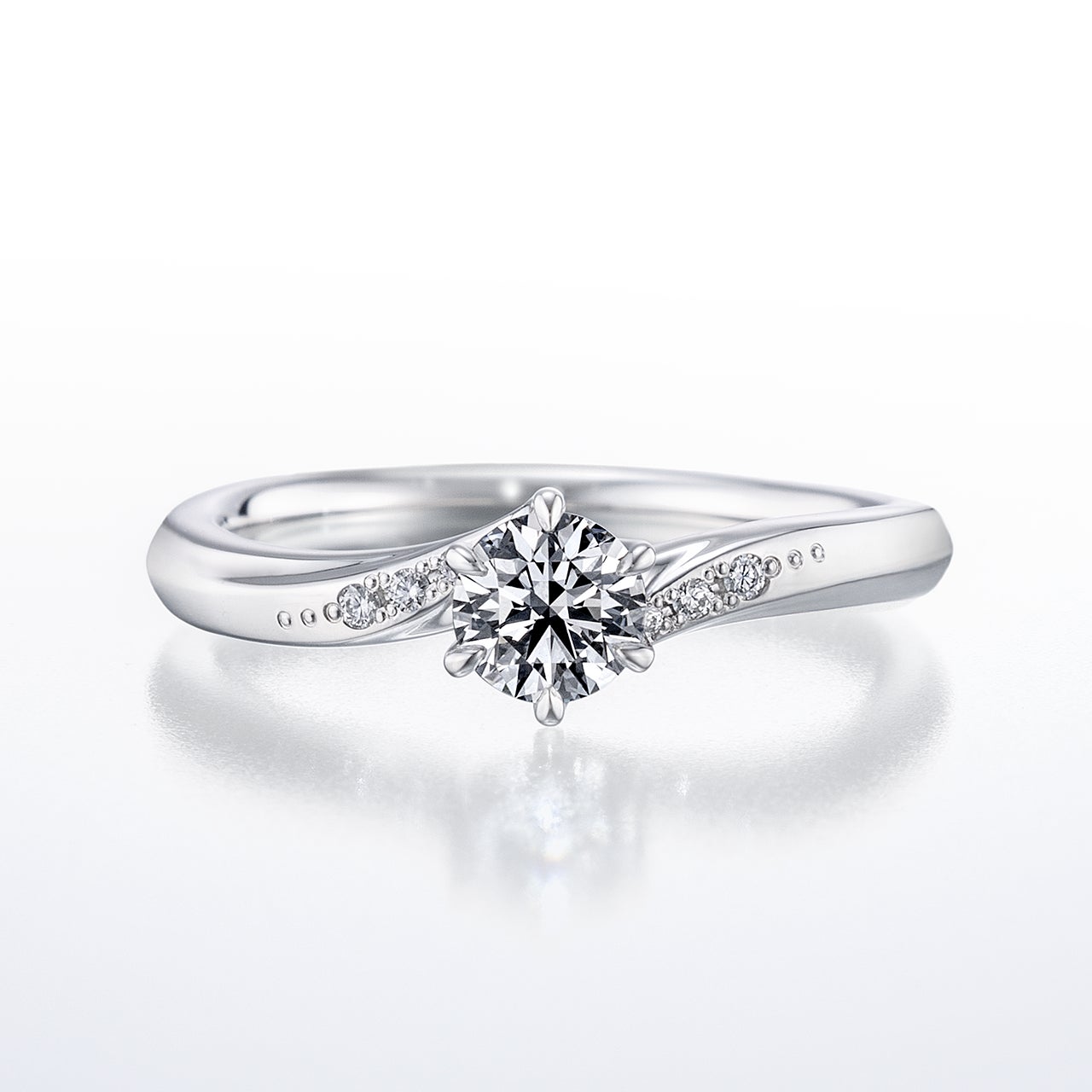ふたりの想いが柔らかな愛に包み込まれるようにプラチナの曲線は優しくダイヤモンドへ向かいます。センターダイヤモンドに光が当たるセッティングで、ふたりが選ぶ純粋なダイヤモンドがより一層強く美しく輝きます。