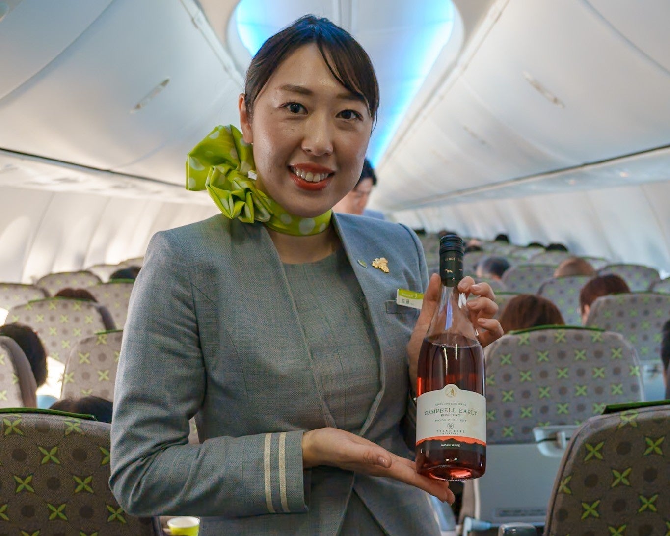 6時50分頃に南アルプス南部上空、高度約5,180mから富士山と初日の出を鑑賞していただき、目的地の宮崎空港へと向かいました。初日の出が現れる瞬間に機内では歓声と拍手が上がり、普段体験することのない景色に感動されるお客さまの姿が印象的でした。また九州・沖縄の食材にこだわったおせちや、ソムリエ資格を持つ客室乗務員が厳選した宮崎県産・都農ワイン「キャンベルアーリー・ドライ」(ロゼワイン)を提供しました。