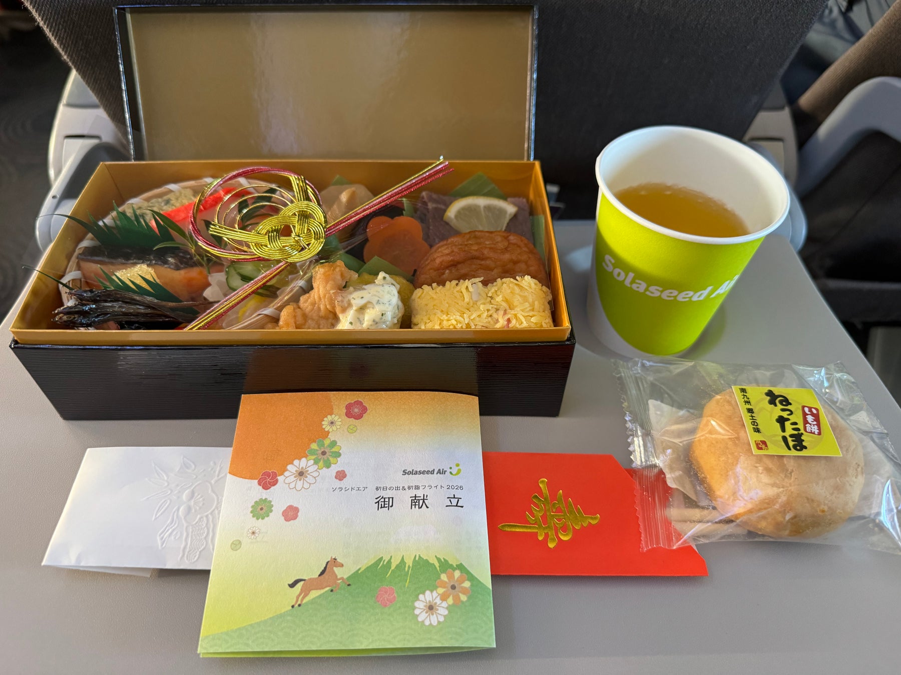 また、「ソラシドエアモデルプレーン1/200」などのオリジナルグッズが当たるくじを配付し、初日の出&初詣フライトならではの企画を楽しんでいただくなど、普段のフライトにはない特別な時間となりました。