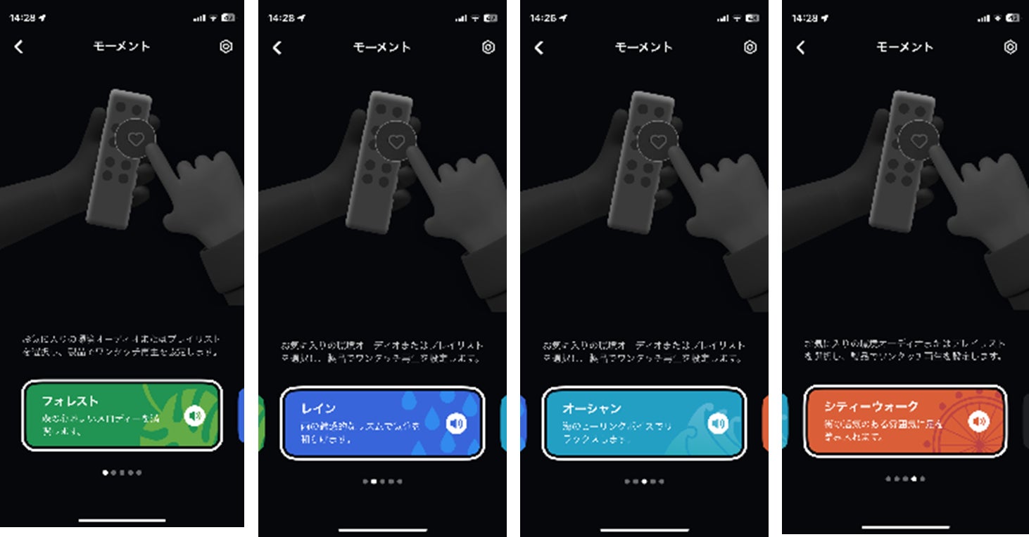 7.1.4chおよび5.1.2chの部屋中を満たすスピーカーで、4つの環境サウンドを再生することが可能になりました。「フォレスト」「レイン」「オーシャン」「シティーウォーク」の中から好きなアンビエントサウンドを選択しモーメントボタンに設定することで、リモコンやアプリから1タップで心地よいサウンドが部屋中を満たします。オフタイマーも設定できますので、リラックスしたい時や集中したい時に時間を決めて周囲の雑音を環境サウンドでマスキングする、という使い方も可能です。