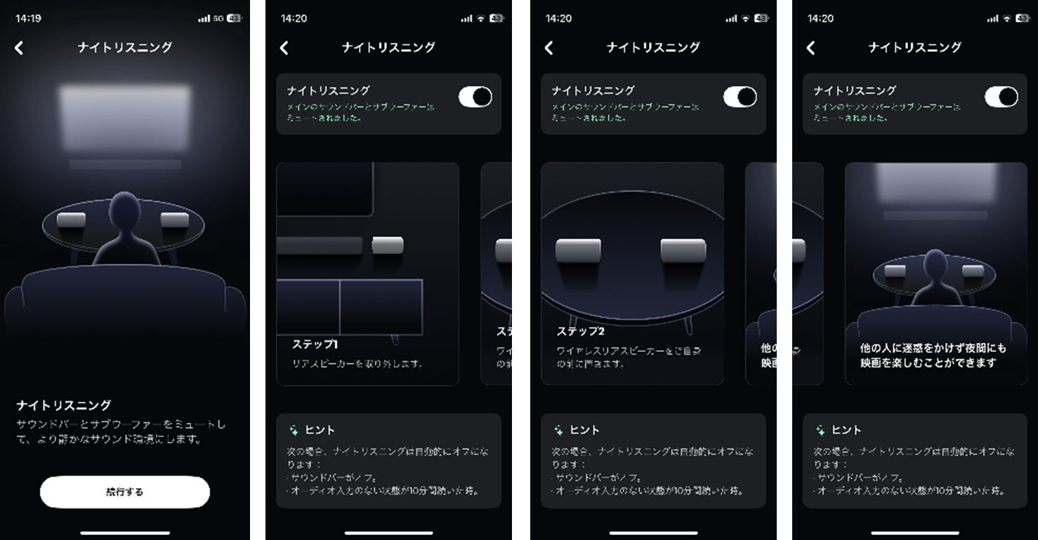 発売からおよそ2年を経て、「BAR 1000」と姉妹機「BAR 800」に搭載されている特徴的な「完全ワイヤレスリアスピーカー」により、これまでのシアターシステムやオーディオシステムでは実現できなかった発想が生まれました。中でも、夜中に映画を楽しみたい時にワイヤレススピーカーを手元に設置し、小音量でも明瞭で迫力あるサウンド再生ができる新機能「ナイトリスニングモード」は、特に隣人への音エチケットが気になる日本の住環境においては最適な新機能となります。