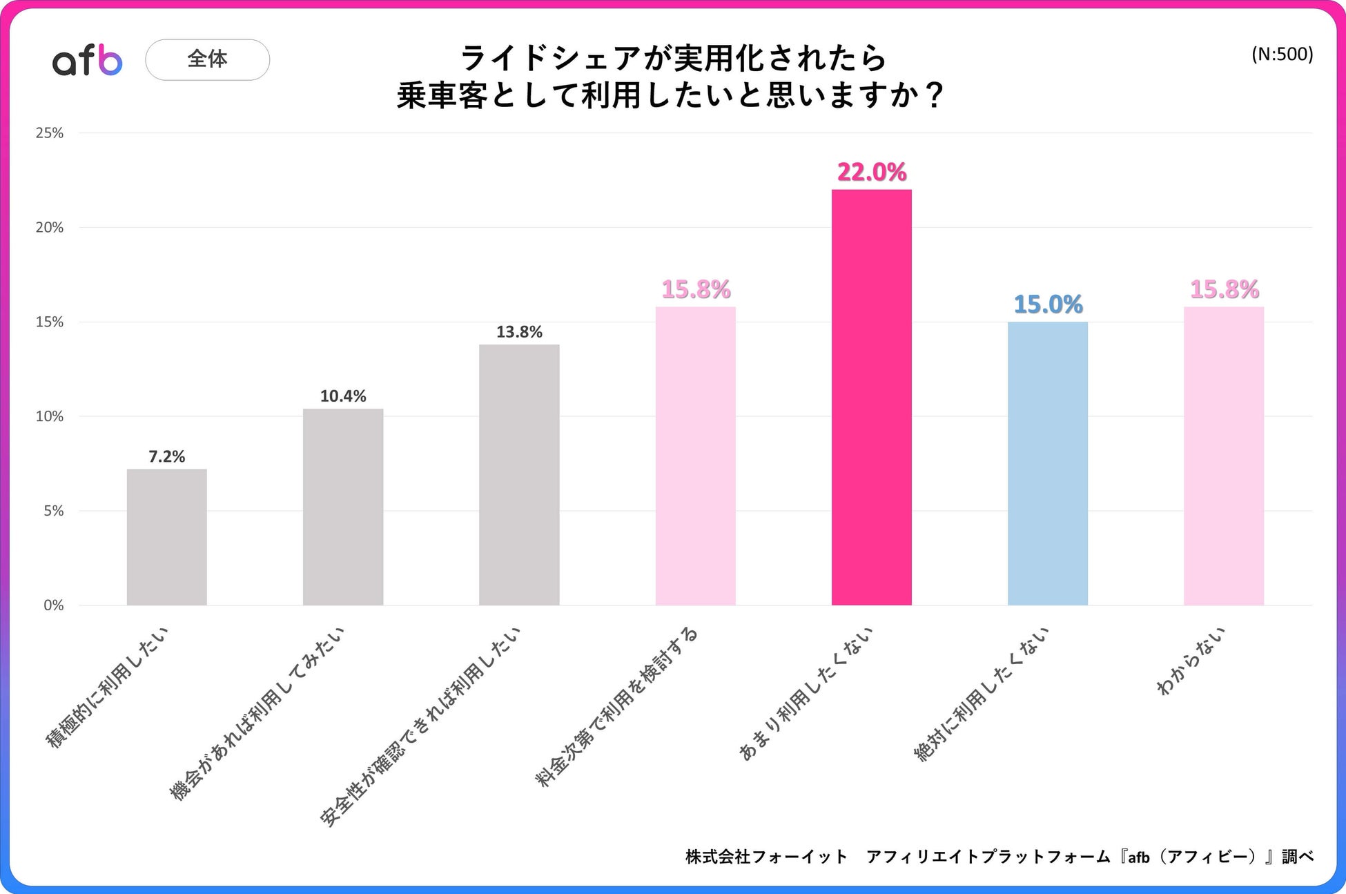 全国の20代〜60代の男女を対象に、「ライドシェア*が実用化されたら乗車客として利用したいと思いますか?」というアンケートを実施したところ、最も多かった回答は「あまり利用したくない」で22.0%でした。次いで、「料金次第で利用を検討する」と「わからない」が15.8%で続くという結果になりました。