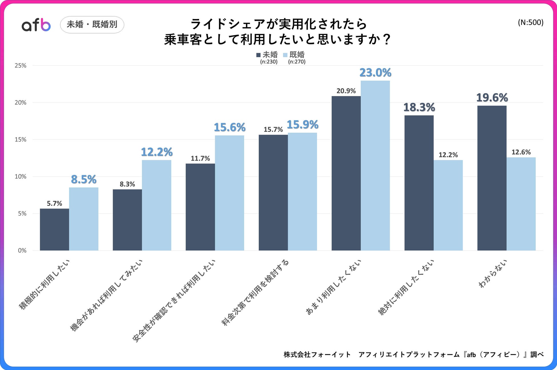 世帯年収別で見ると、世帯年収が「〜500万円」や「501万〜1,000万円」の層ではライドシェアの利用に慎重な回答をした方が多かったのに対して、「1,001万円〜」の層では「積極的に利用したい」と回答した方が16.7%と10%以上の差をつける結果となりました。たとえ割高であっても移動時間が短縮できるのであれば、支出を厭わない傾向にあることが推察されます。また、単に移動手段としてだけでなく、「新しいサービスを体験する」という「経験」そのものに価値を見出している可能性も考えられました。