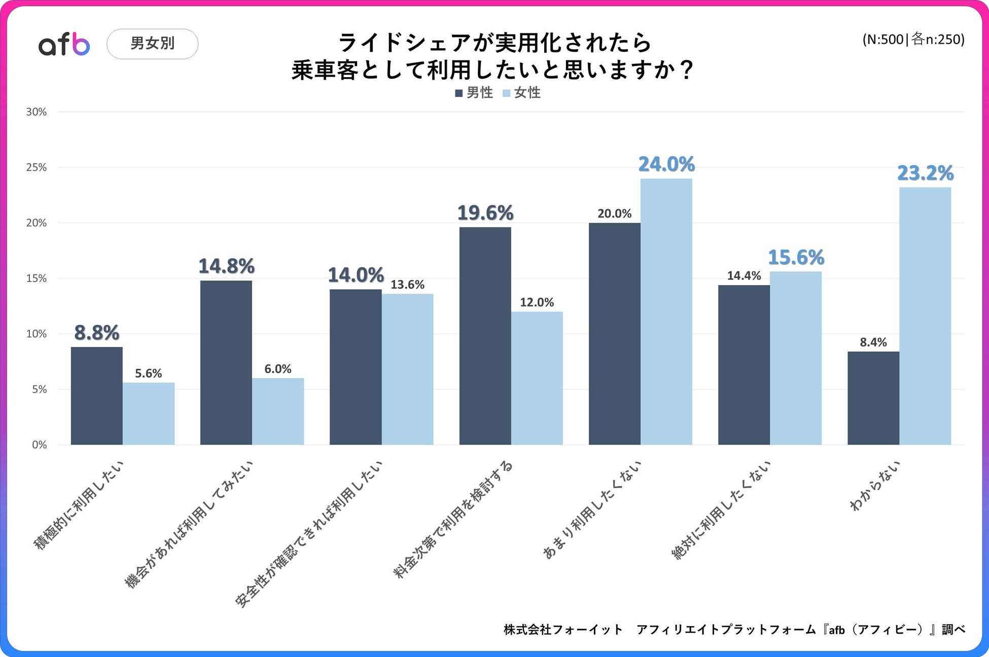 男女別で見ると、「積極的に利用したい」や「機会があれば利用してみたい」などの回答をした方は男性が多かったのに対して、「利用したくない」や「わからない」と回答した方は女性が多く、男性の方がライドシェアの利用にポジティブな傾向があることが分かりました。日本では「知らない人の車に乗る」という行為自体の心理的ハードルが高く、とりわけ女性の場合は犯罪やセクハラ被害などを懸念する方が多いと考えられます。通常のタクシーであればきちんと会社に登録されていたり、防犯カメラが設置されていたりするため、わざわざライドシェアを利用したいという女性は少ないことが推察されます。しかし、「安全性が確認できれば利用したい」と回答した女性も13.6%いることから、安全面での懸念が解消されれば利用する女性は多いのかもしれません。