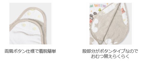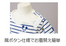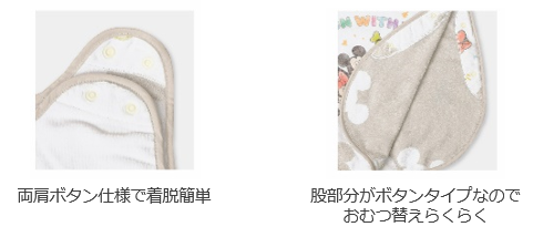 肩にはボタンが付いているのでお着替えが簡単。かわいい総柄が目を惹く1着です。