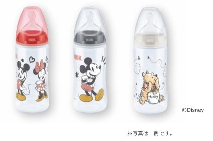 赤ちゃんのお口にフィットするNUKのほ乳びん。ミルクの飲み頃の適温がわかる、色が変わるメモリ付き。