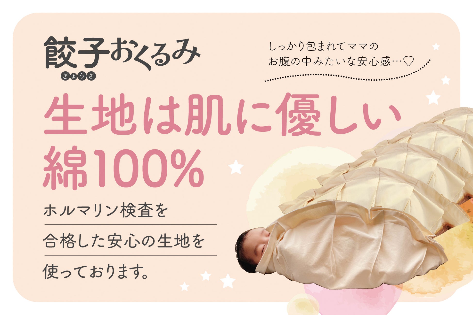 このおくるみは息子が生後4ヶ月の時に思いつきました。むちむちとした赤ちゃんが餃子の皮に包まれたら餡みたいに見えるかな、と我が子の安らかな寝顔を思いながら作った思い入れのあるものです。SNSに投稿した際には多くの方から『カワイイ!』と仰って頂きとても嬉しかったです。