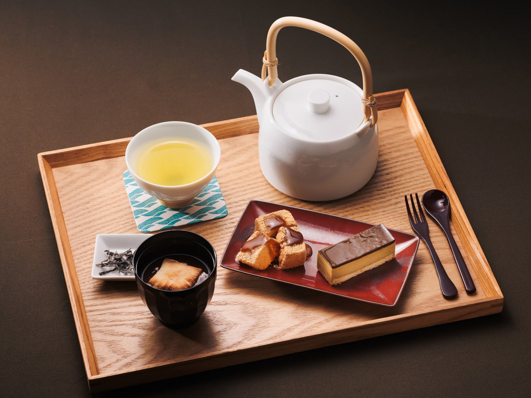 三種類の甘味と緑茶がセットになった御膳。お茶との相性をお楽しみください。