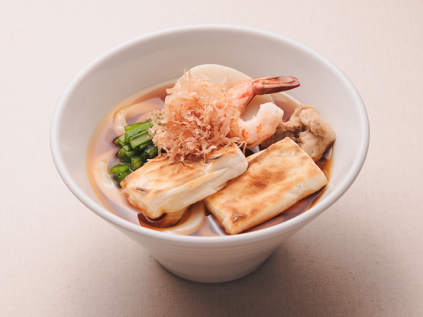焼き餅や車海老、モチモチの極太うどんをだしがきいたつゆでお楽しみください。