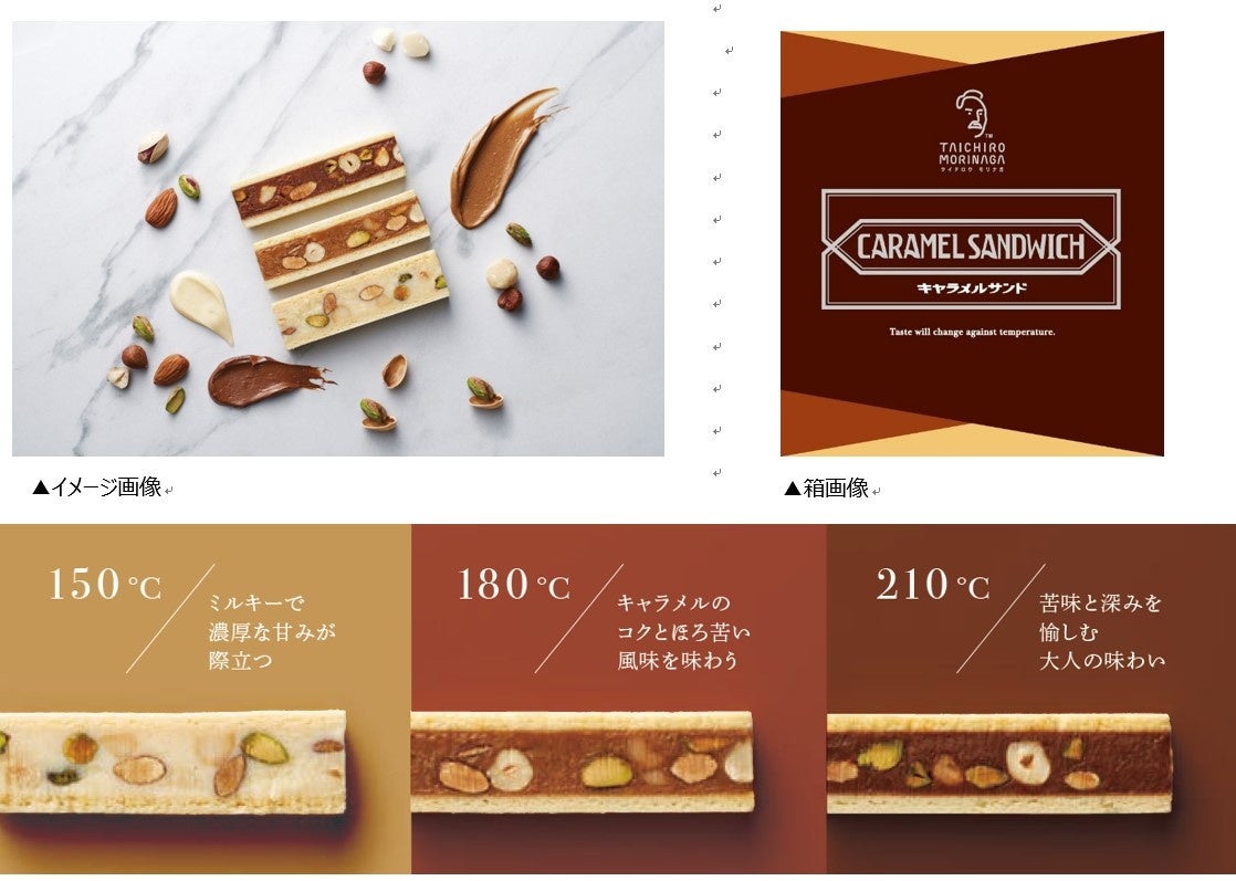 今回発売する「TAICHIRO MORINAGA キャラメルサンド」は、なめらかで濃密なキャラメルガナッシュに香ばしいナッツを混ぜ、バターたっぷりのサブレ生地ではさんだ贅沢なキャラメルサンドです。キャラメルづくりにとって美味しさの重要な鍵となるのが「キャラメルの温度」です。120余年かけて磨き上げたキャラメルづくりの技術を活かし、煮詰める温度によって変化していく味わいを3種類の「キャラメルサンド」で表現しました。