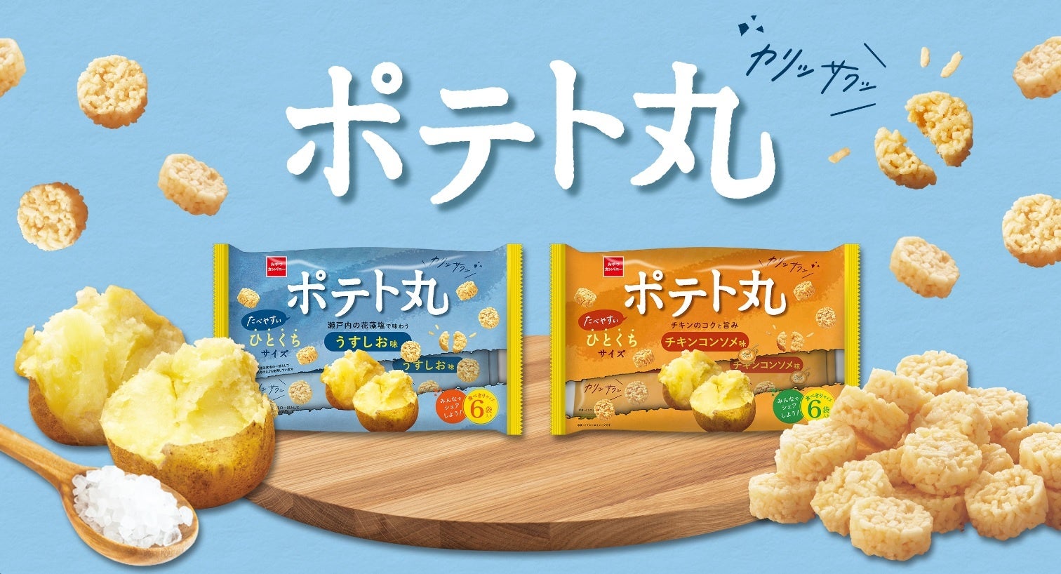コロコロと丸いカタチと、カリッサクッとした軽快な食感はそのままに、定番の「うすしお味」は瀬戸内の花藻塩を使用することで、まろやかな塩気と後引く旨みが引き立てるポテトのやさしい味わいにリニューアル。また、新フレーバーとして、チキンのコクと旨みが広がる「ポテト丸(チキンコンソメ味)」も同時発売。ひとくちでポテトの美味しさが口いっぱいに広がる、とってもポテトなスナック菓子に仕上がりました。