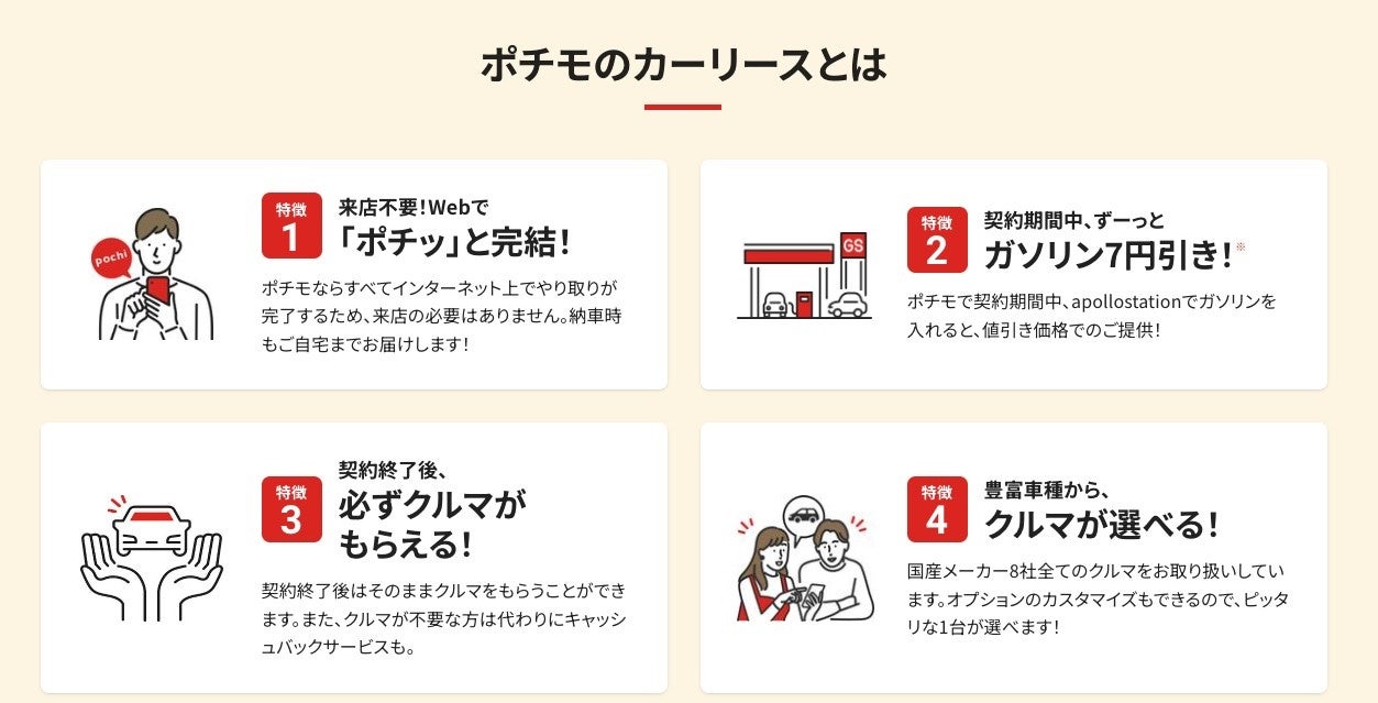 「ポチモ」は、カーライフの多様化にあわせ、自宅にいながらオンラインでリース契約を行い、毎月定額で車を利用できるカーリースサービスです。物価高騰に伴い販売価格が上昇している新車を月々定額で手軽に利用いただけるよう、契約期間は9年に設定しました。走行距離は無制限で車をご利用いただけます。また、契約期間中はガソリンが7円/L引き※で給油いただけるほか、メンテナンスは当社系列サービスステーション(以下、SS)もしくは提携リース会社の工場で対応します。リース契約終了後は、2つの選択肢から選択が可能です。