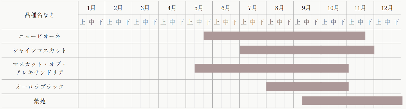 現在、岡山県では「マスカット・オブ・アレキサンドリア」で培った技術を生かし、大粒で種無しのニューピオーネ、 ワインレッドの色が美しい「紫苑」、近年高い人気を誇る「シャインマスカット」などの多くの品種が栽培されています。いずれも糖度の高さや房形などで高い評価を得ています。