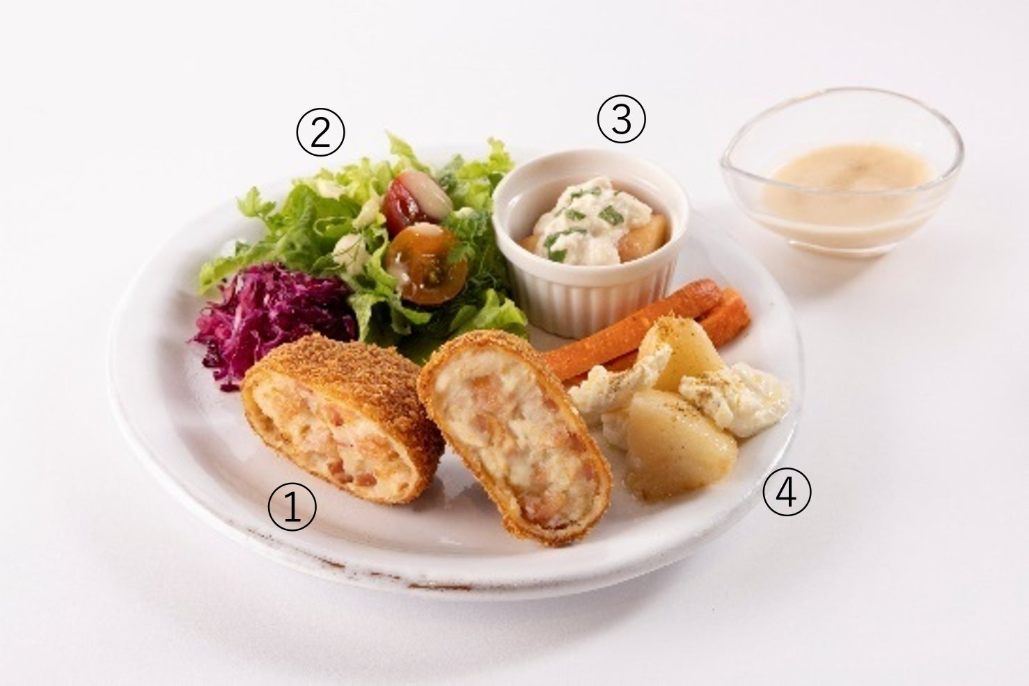 ① そのままでも美味しいメインの白桃コロッケには、ソースはもちろん塩コショウがマッチ!