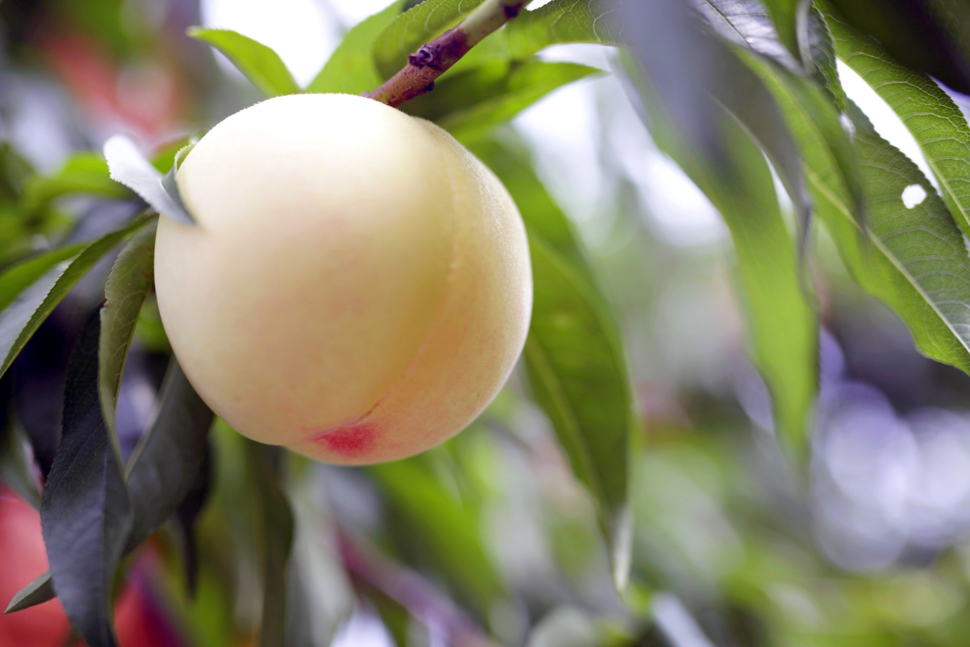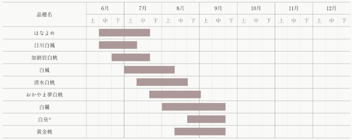 岡山県の桃は“白桃”であり、名前の通りその白さが特徴です。明治初期に白桃が品種改良によって誕生し、本格的な栽培がスタート。小さい実のうちから袋掛けを行う全国でも珍しい栽培方法により、害虫や雨風、直射日光から実を守ることで薄い果皮と香りの高さ、果汁たっぷりのやわらかく滑らかな舌触り、そして上品な甘さを持った白桃が生まれます。現在の栽培面積は全国6位(2023年現在)ですが、「白桃」や「清水白桃」を始めとした栽培の主流である品種の大半は岡山県がルーツとなっています。