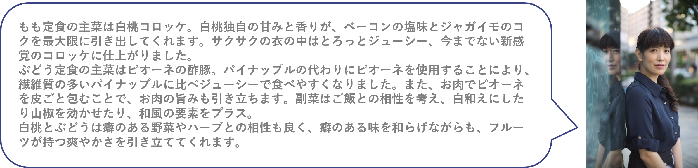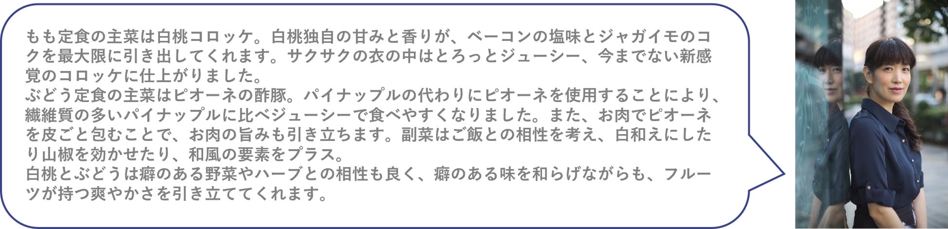 今回開催する「晴れの国おかやま・フルーツ食堂~もも定食・ぶどう定食~」では、白桃とぶどうがそれぞれ定食に大変身!フルーツが持つ味わいを最大限に生かしつつも、見た目も楽しめるようメニューを開発し、“食事”にすることで新たな可能性を追求しています。ここでしか食べることができないメニューをぜひお楽しみください。