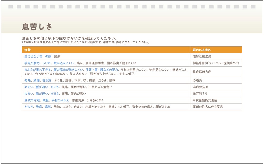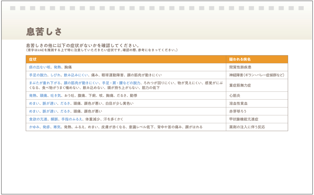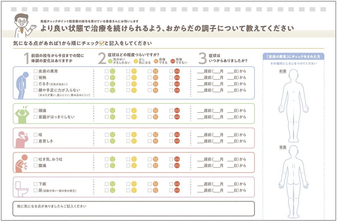 本ツールは、「説明用ボード」・「問診票」そして臨床的に重要度の高い症状から発現が疑われる有害事象を推測する「逆引きマニュアル」の3種類から構成されており、本ツールを活用することで、患者さんはご自身の症状を医療従事者に伝えやすくなり、医療従事者はimAEの早期発見・治療介入といった、効果的なimAEマネジメントが期待できます。