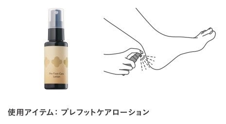 かかとにプレフットケアローションを約3プッシュ吹きかけ、かかとの角質に浸透させます。