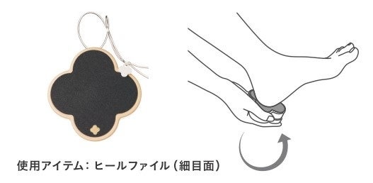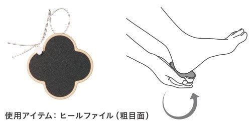 かかとが乾燥した状態のまま、ヒールファイルの粗目面(お花型のマークがない面)で円を描くように硬いかかとの表面を粗削りし、プレフットケアローションをかかとの角質に浸透しやすくします。