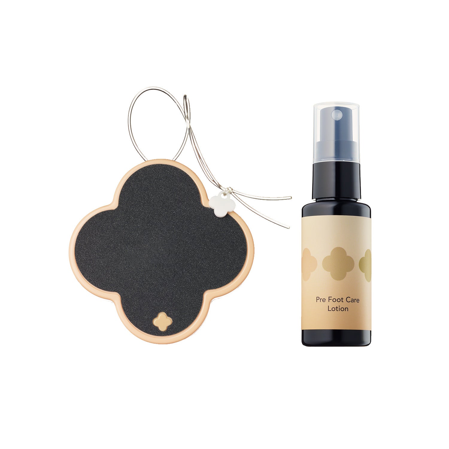 角質を削るための「ヒールファイル(限定デザイン)」とかかとを削る前のプレケアや普段の保湿にも使用できる「プレフットケアローション」をセット。ごわつきが気になったときに、気軽にかかとケアにトライしやすい2アイテムで、ギフトにもおすすめです。ローションは、精油を各種配合し、ケアの間に心がほっとやすらぐ香りにリニューアルしています。