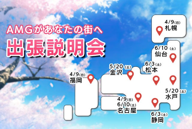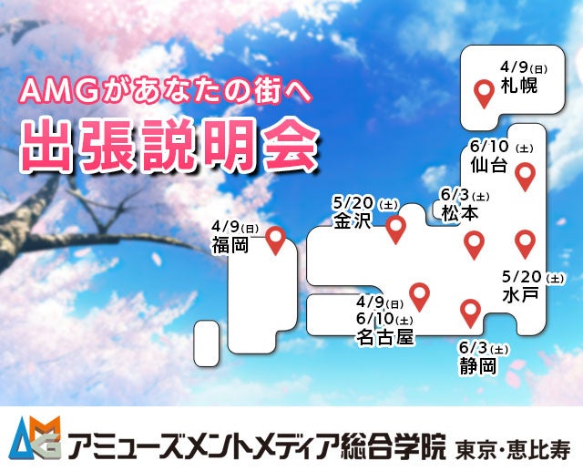 エンタメ業界のプロを育成するアミューズメントメディア総合学院(東京都渋谷区、理事長:吉田 尚剛、以下AMG)は、4/9(日)、5/20(土)、6/3(土)、6/10(土)に2024年度入學をご希望の方向けの出張説明会を全国8都市で開催することをお知らせいたします。
