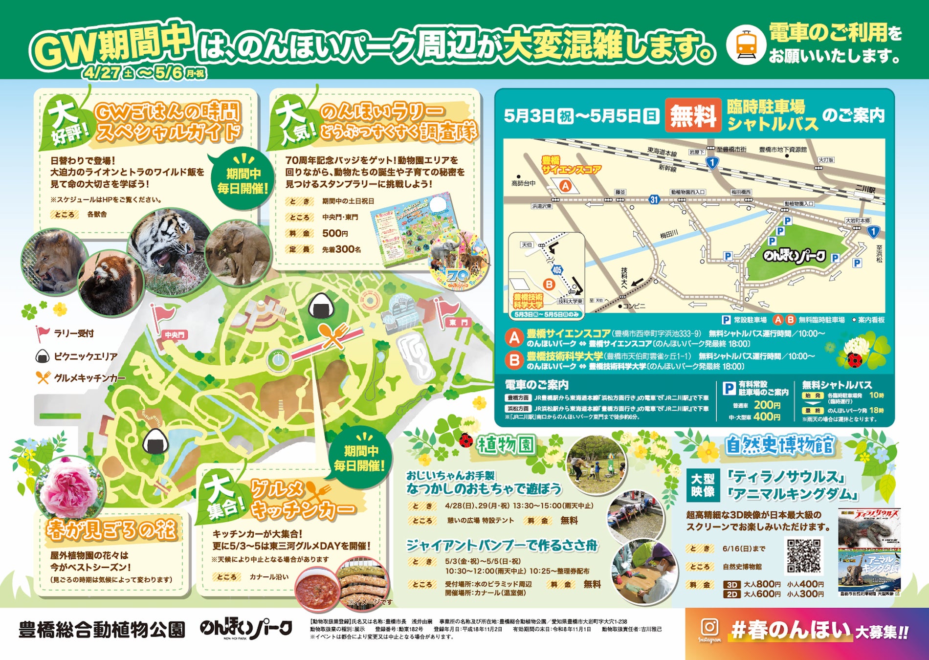 GW期間中、のんほいパーク周辺は大変混雑しますので、電車でのご来園にご協力ください。お車でお越しの場合は無料の臨時駐車場もご利用ください。無料臨時駐車場では無料シャトルバスの送迎もあります。