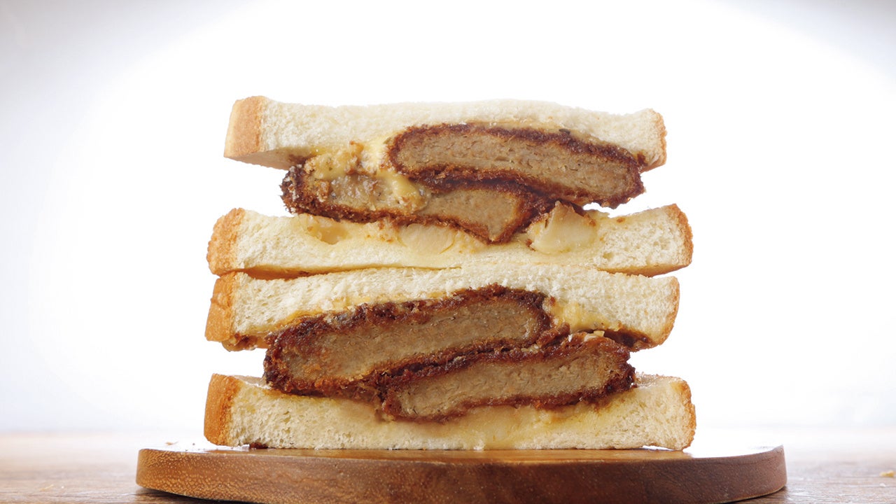 商品特長:トーストにキャベツメンチカツ2個、ポテトサラダ、マヨネーズ、タルタルソースをトッピングしました。ずっしりとした重みを感じる、食べ応え充分のサンドイッチです。