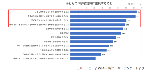 いこーよ子どもの未来と生きる力研究所の調査では、多くの保護者が「子どもの好奇心をくすぐる内容であること」「普段の生活や学校では体験できないこと」など、体験で得られる価値や心の成長を重視して子どもの体験を選んでいるという結果が得られています。「いこーよ好き育メソッド」には、このような保護者のニーズに応える体験プログラム作成のノウハウがあります。