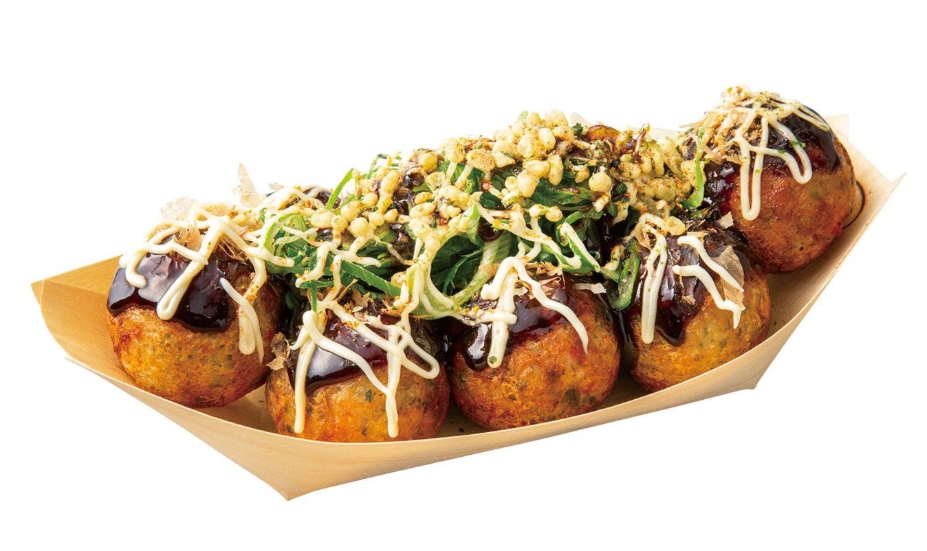今回はコラボたこ焼専用ソースとして、特製「一平ちゃん夜店の焼そば風ソース」を開発!特製ソースの上に、シャキシャキの九条ねぎをたっぷり乗せ、サクサク食感がアクセントのイカ天かすをトッピング。最後に別添えの「一平ちゃんオリジナル からしマヨネーズ」をかけてお召し上がりいただく商品です。