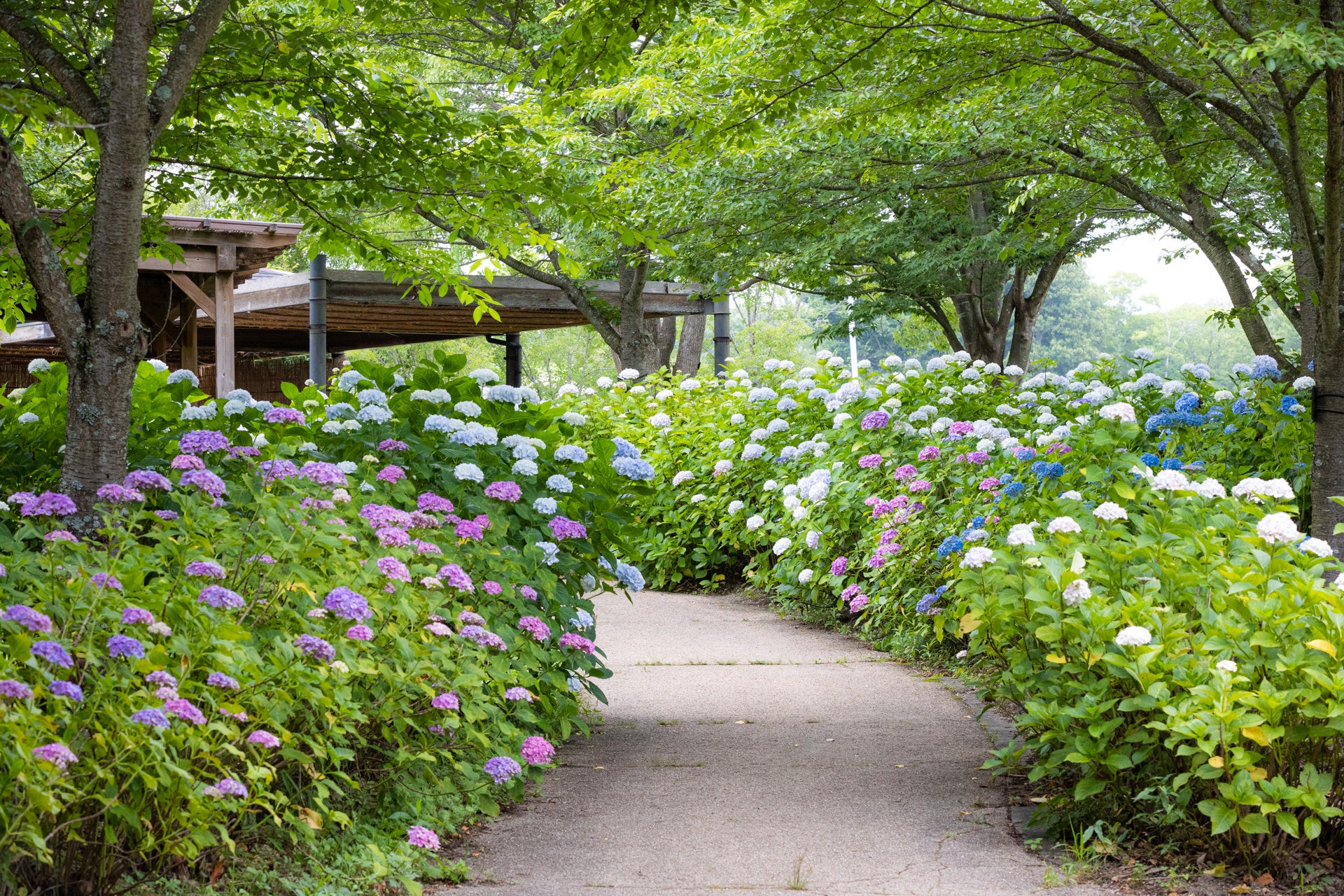 「あじさいまつり」開催中の国営讃岐まんのう公園にて、四国最大級40品種2万本のあじさいが見頃を迎えています。