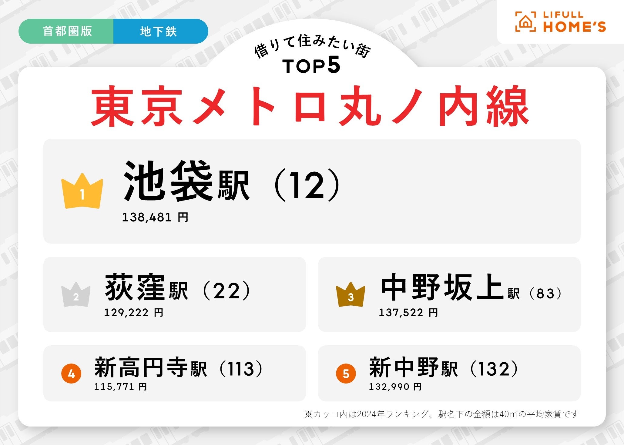 1位「池袋」(東京都豊島区)は、丸ノ内線の始発駅で、東京メトロ副都心線や有楽町線、1日の乗員客数が45万人以上が利用するJRや私鉄が利用できる都内屈指のターミナル駅です。百貨店や家電量販店、商業施設が集積し、生活利便性も高く、コロナ禍前までは「住みたい街ランキング」で永らく首位をキープしていた人気の駅です。2位「荻窪」(東京都杉並区)は、丸の内線の始発駅で、東京メトロ東西線やJR中央線、JR総武線の複数利用が可能です。駅周辺は商業施設や飲食店が多く、駅前や環状八号線通り沿いにはマンションが増えています。一方で、文化人財界人の屋敷跡の公園も複数あるなど住宅街には一戸建ても多くあります。4位「新高円寺」(東京都杉並区)は、徒歩13分圏内のJR「高円寺」も利用可能です。2駅間はルック商店街とパル商店街の2つの商店街によって結ばれています。商店街には、日用品の店以外に、古着屋やライブハウス、古書店などがあります。さらに、“阿波踊り”や街の文化祭である“高円寺フェス”など、イベントも盛りだくさんなためアクティブな生活を送りたい人におすすめの街です。5位「新中野」(東京都中野区)は、「新宿」まで最短5分、複数のバス路線やJR「中野」も徒歩圏内にあり、交通の利便性を重要視する人におすすめです。コンビニやスーパーが充実しているだけでなく、駅前の鍋屋横丁は古き良き昭和の雰囲気を残す商店街で、駅の周辺には4軒も銭湯があり、新しさと懐かしさが混ざった街並みも特徴です。JR「中野」周辺には区役所、総合病院、大型商業施設などもあり、日常生活で必要な多くのことは近場で済ませることができ忙しい日々を送るビジネスパーソンと相性の良い街です。