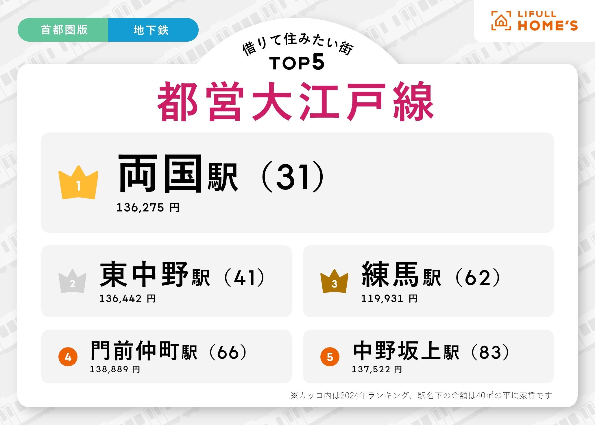 「住みたい街が多い鉄道路線ランキング首都圏・地下鉄編」の2位は都営大江戸線です。都営大江戸線における住みたい街1位は「両国」(借りて住みたい街ランキング首都圏版31位)、2位「東中野」(同41位)、3位「練馬」(同62位)、4位「門前仲町」(同66位)、5位「中野坂上(同83位)」となりました。都営大江戸線は、TOP200内に11駅がランクインしています。都営大江戸線は東京都練馬区の「光が丘」から新宿区の「都庁前」までのルートと、「都庁前」から2方向での環状運行をしています。沿線には、東京国立競技場や東京タワー、両国国技館、築地市場など東京の観光名所があります。