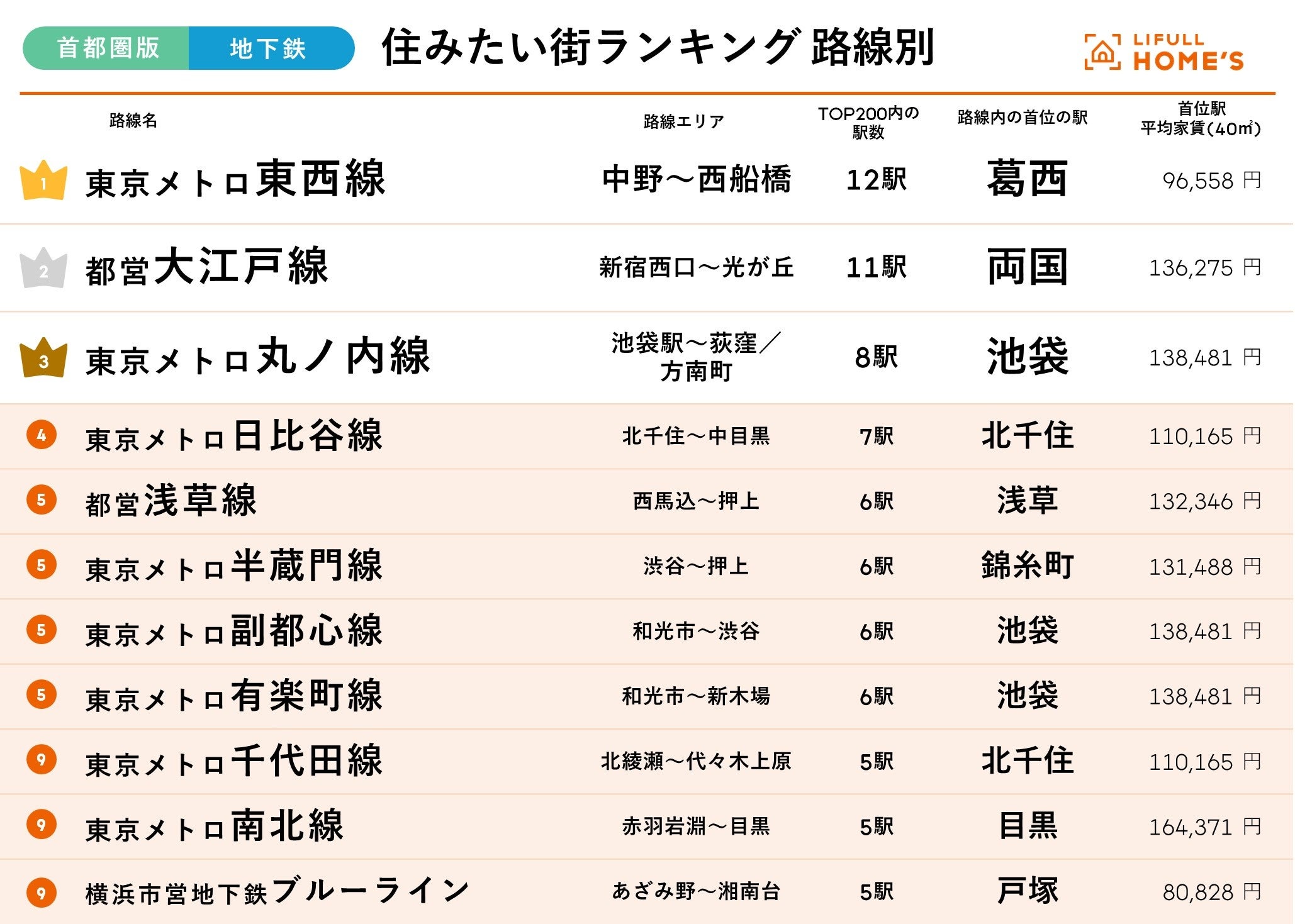首都圏における「借りて住みたい街ランキング」TOP200内の駅と路線を対象に地下鉄の路線別に集計した、「住みたい街が多い鉄道路線ランキング・首都圏地下鉄編」は12駅がランクインした東京メトロ東西線が1位となりました。2位は都営大江戸線(TOP200内ランクイン数:11駅)、3位は東京メトロ丸ノ内線(同8駅)が続きます。4位は東京メトロ日比谷線(同7駅)、5位は都営浅草線、東京メトロ半蔵門線、東京メトロ副都心線、東京メトロ有楽町線(同6駅)、9位は東京メトロ千代田線、東京メトロ南北線、横浜市営地下鉄ブルーライン(同5駅)となりました。