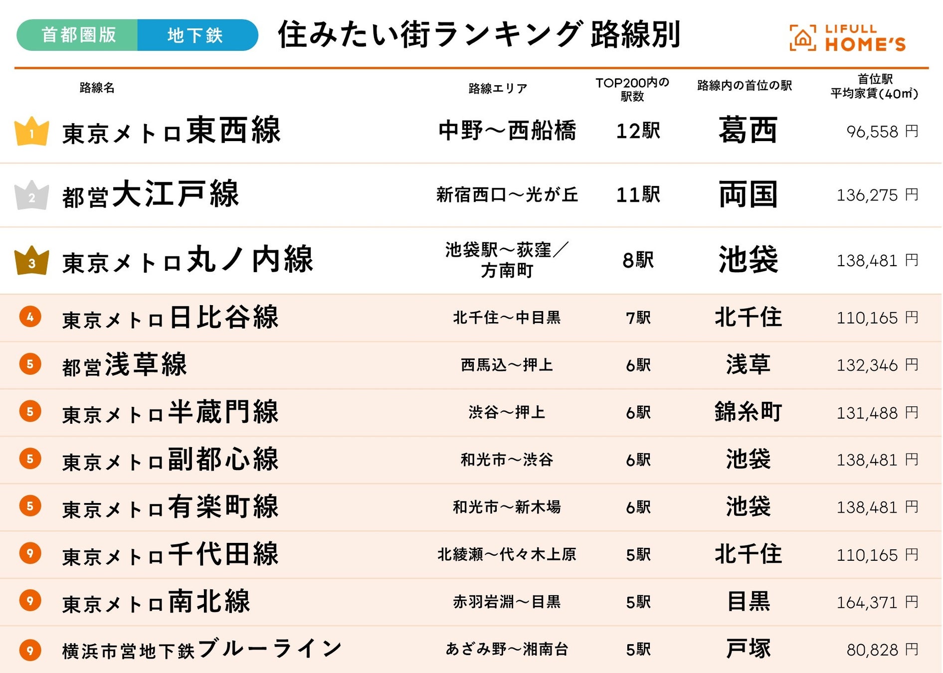 今回は、首都圏における「借りて住みたい街ランキング」TOP200内の駅を路線別に集計し、首都圏の地下鉄の路線における「住みたい街が多い鉄道路線ランキング首都圏・地下鉄編」と上位にランクインした路線ごとの住みたい街TOP5を発表します。