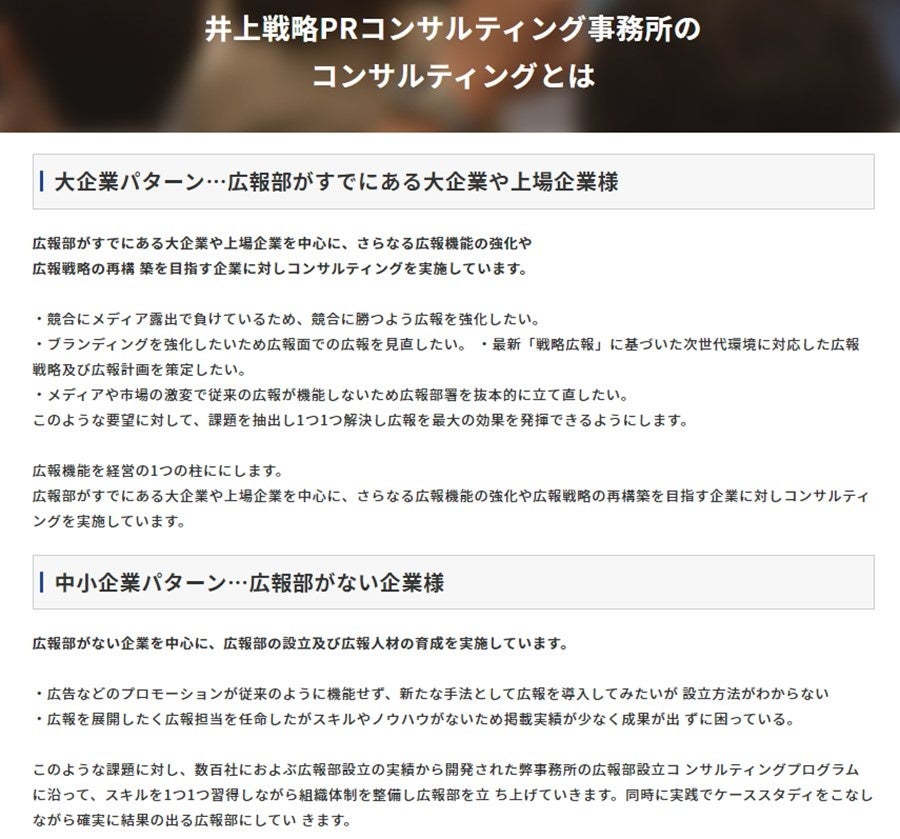 戦略広報の実践実務の第一人者で、トップ広報コンサルタントと称される井上岳久が率いるコンサルティングファームです。