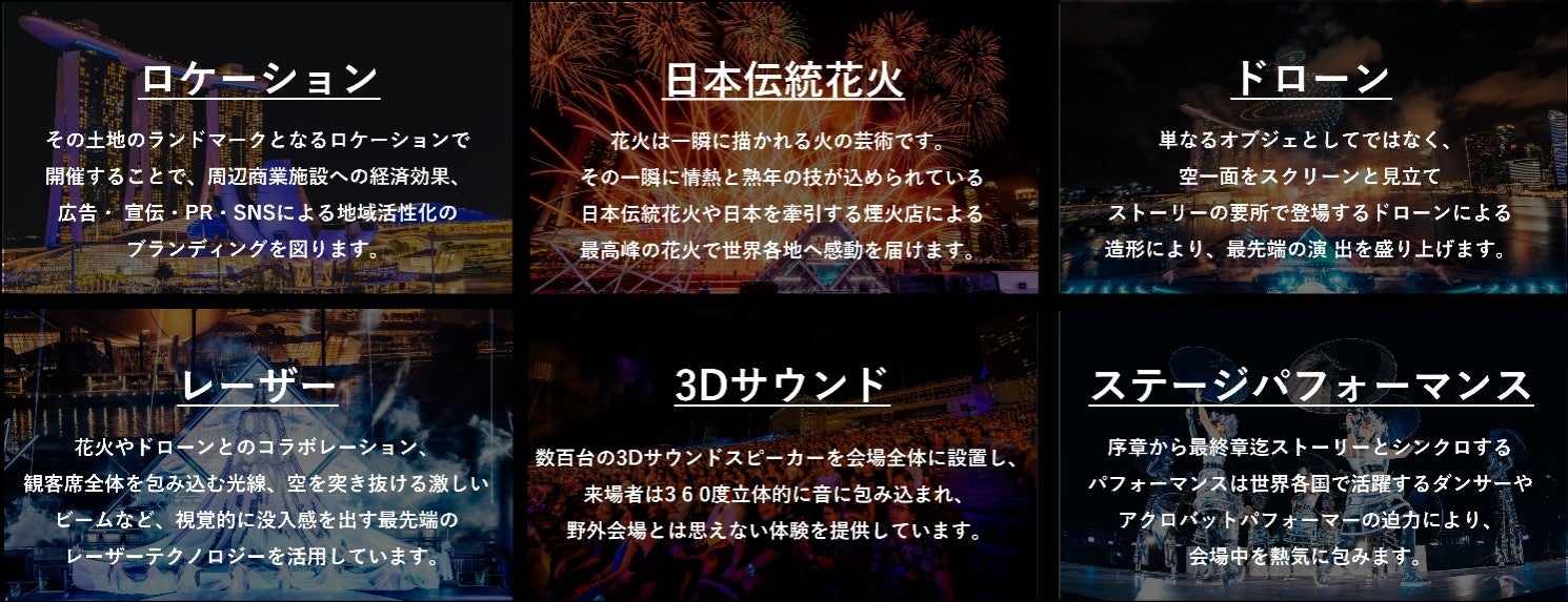 STAR ISLANDはシンガポールやサウジアラビアなど、世界各国で公演を重ね、世界中の方々からパフォーマンスに対して高い評価を受けてまいりました。以下6つが、STAR ISLANDを構成する要素です。