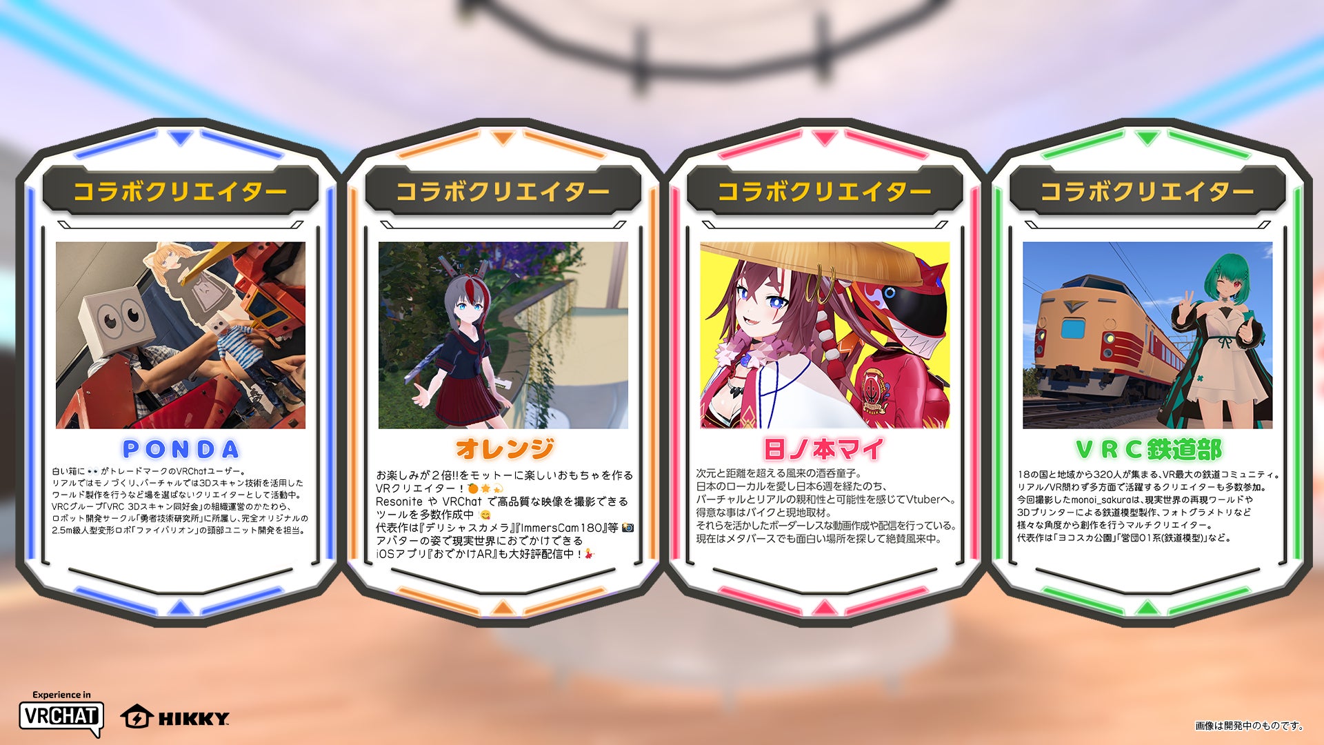 今回の出展では、VTuberの「日ノ本マイ」さん、クリエイターの「オレンジ」さんと「PONDA」さん、人気コミュニティ「VRC鉄道部」さんとのコラボによる3D VR映像を展示。クリエイターコラボのコンテンツをとおして、3D VR映像の制作に関心を持っていただければ幸いです。