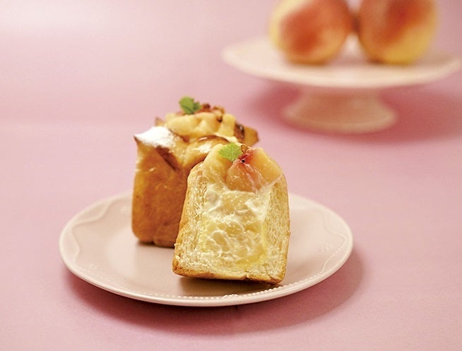 福島県産白桃を贅沢に使用したプレミアムクリームパン。白桃ヨーグルトとカスタードの2種のクリームを包みました。